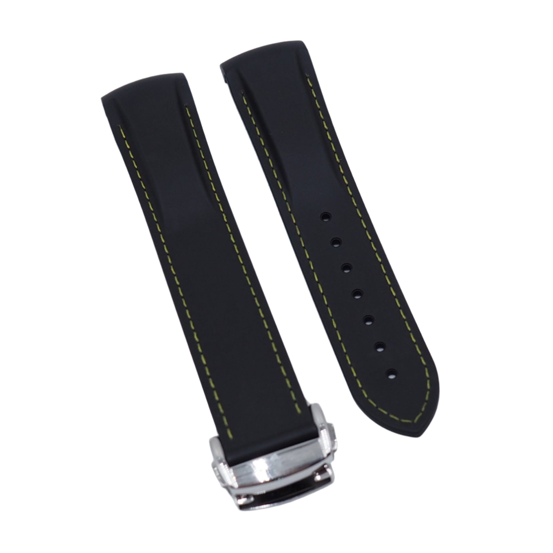 20mm, 22mm Curved End Black FKM Rubber Watch Strap, Yellow Stitching For Omega